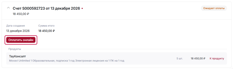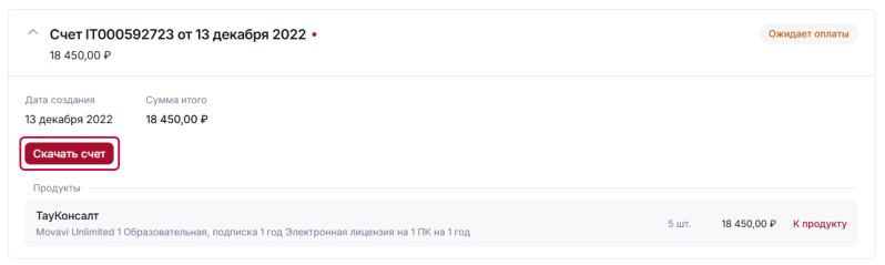 Обратите внимание. Кнопка оплаты / скачивания счета отображается только если срок жизни счета (30 дней) не истек. После 30 дней кнопка не отображается и оплатить счет нельзя. Создайте новый заказ.